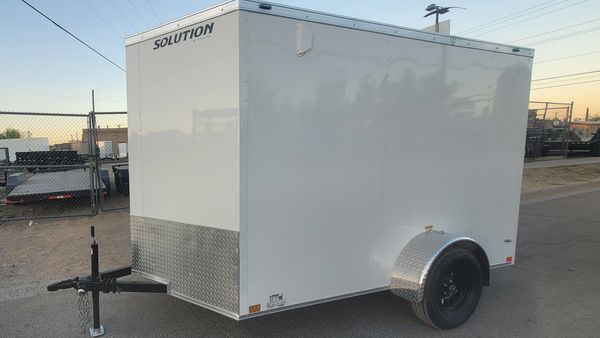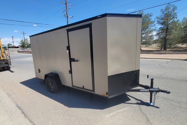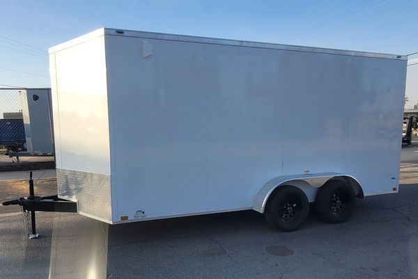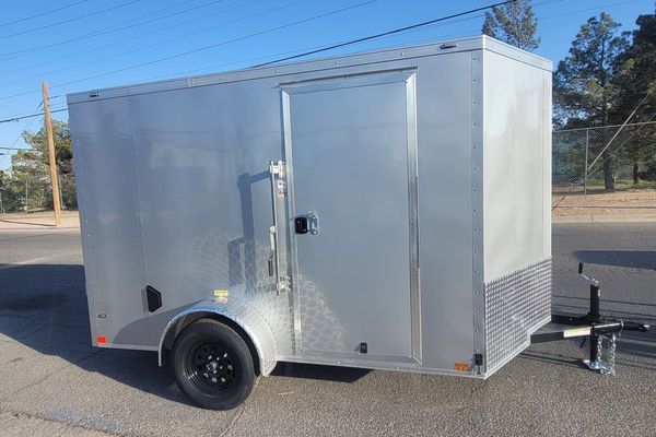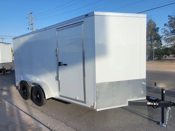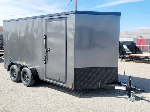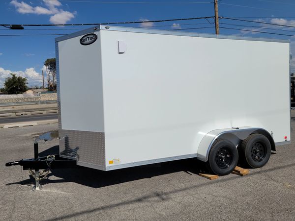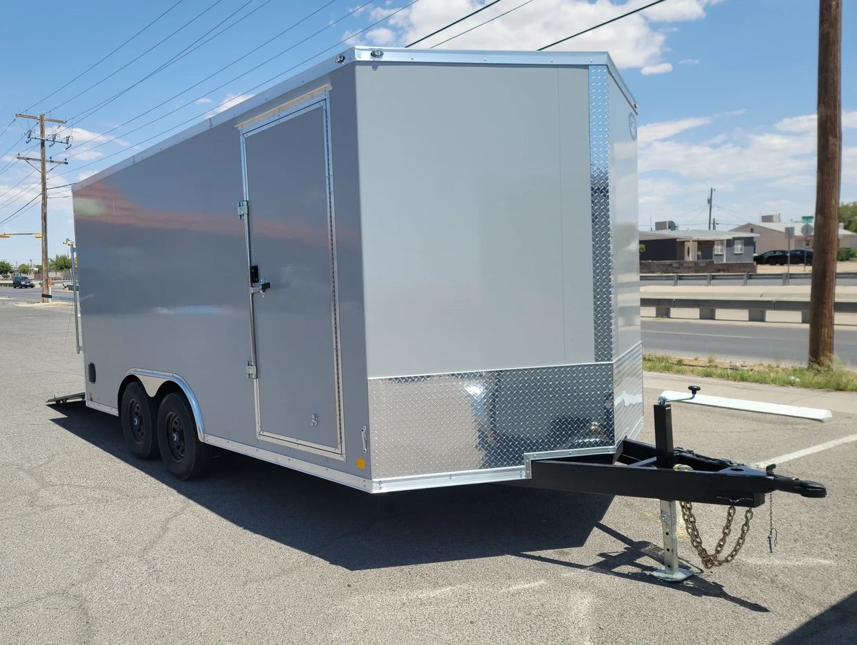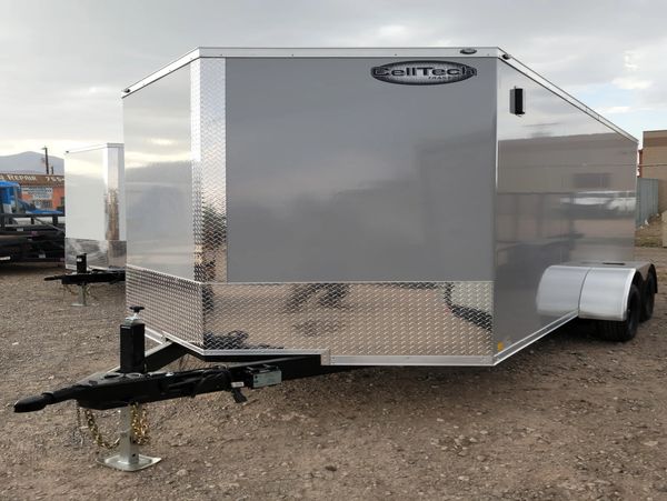 Made by CellTech Trailers. It comes with two 5,200 lb. axles, electric brakes on all four wheels, a side door with a flush lock and cam bar latch, 16" gravel guard, 4 interior lights, all galvanized steel construction, no wood to expand or rot, and LED exterior lights. The walls, floor and roof are a bonded galvanized structural panel with a heavy duty tube frame underneath. It has a number of e-track sections for easy tie down options. CellTech builds a high quality trailer.